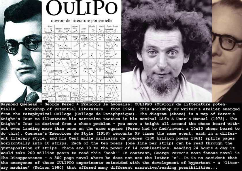 Right at the beginning of the Sixties, a group of avant garde writers, mathematicians and conceptual artists gather to explore the future of literature – and the ideas that will inform much of our cultural history. They form a workshop to explore Potential Literature – notions of chance, excision, linking, symmetry, algorithms, and “the seeking of new structures and patterns which may be used by writers in any way they enjoy.” In a decade that saw the coining of the word hypertext (Nelson 1965) and the programming of the first hypertext system (Van Dam 1968), OULIPPO’s adventurous exploration of literary form and composition lays the conceptual foundations.