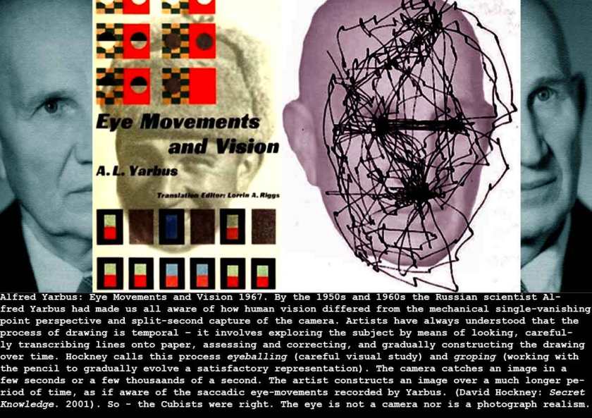This was a significant breakthrough in the science of visual perception – the results of Yarbus’ extensive research and development of eyeball- or gaze-tracking technology that enabled him to discover how we actually see. At last we could dispense with the mechanistic metaphor (current since the 19th century) that the eye is like a camera. (The perceptual psychologist Ralph Haber has called this ‘one of the most potent though misguided metaphors in psychology’ (quoted in Morton Hunt: The Story of Psychology 2009.)