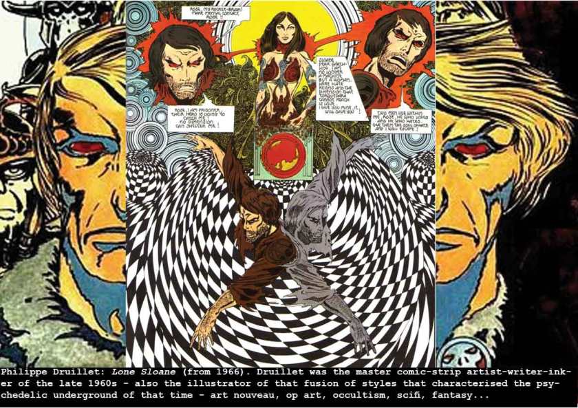 I discovered Druillet’s fabulous bande dessinee in the Shakespeare and Co Bookshop on a visit to Paris in 1969 with the writer Chris Robbins and my wife Jenny. I’d seen some American underground comics in the UK, but this was comic-strip art raised to the level of fine art – printed on coated art paper, published in hard-back, and containing Druillet’s personal mix of sci-fi, fantasy, counter-culture life-styles, hippie mores, op-art, pop-art, and Escher-like comic-strip framing. Druillet’s counter-culture hero, Lone Sloane, wanders through inter-galactic hyper-space like Godard’s Lemmy Caution (in Alphaville), Jean claude Forest’s Barbarella (1962-1964) and Guy Peelaert’s Jodelle (1966).